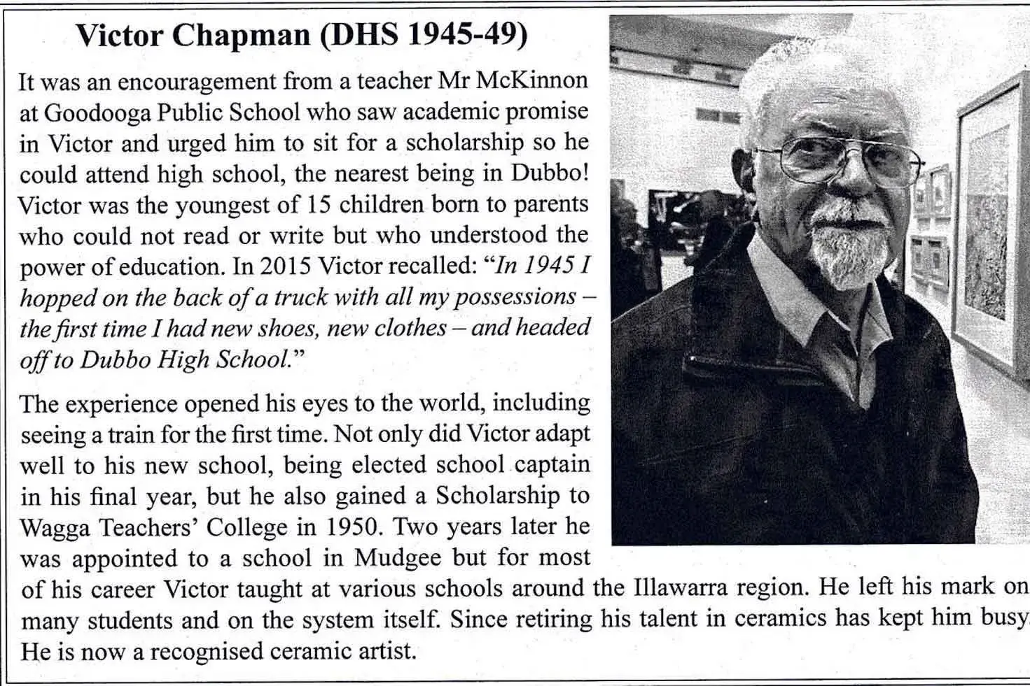Seeing a train for the first time, he excelled academically, gaining a scholarship to Wagga Teachers College in 1950 before working at many schools around the State before being appointed the first Aboriginal school principal in NSW. Later, he became a talented ceramics artist.