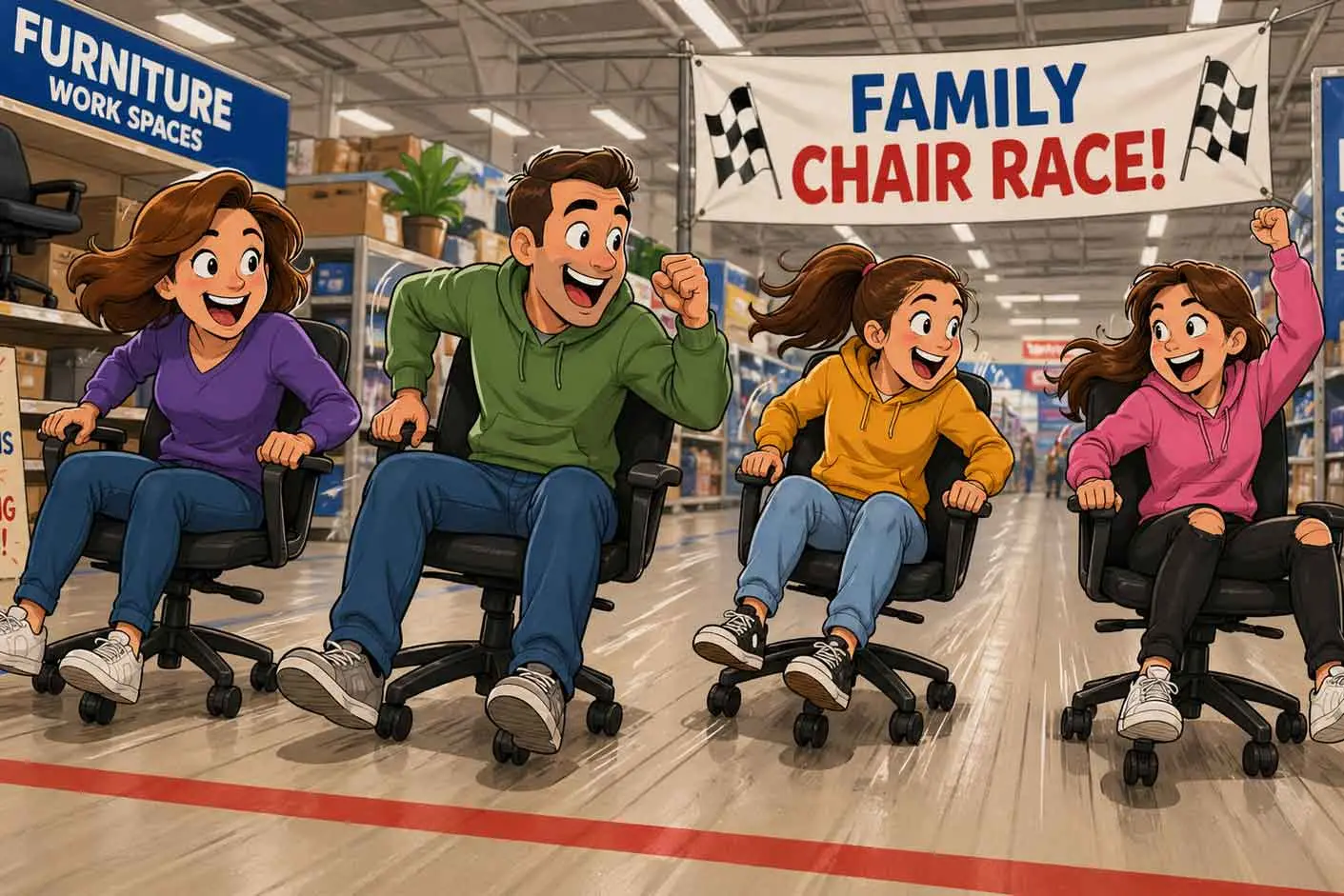 I then bundle my family off to Officeworks for our annual family office chair race. I side bash Miss 17 out of the way immediately and catch hubby, who is in the lead, I try to pull him back, but he surges ahead and wins at the last moment. I drop Miss 11 to a sleepover, have a blended juice instead of coffee with friends in town and head home for a quiet night.