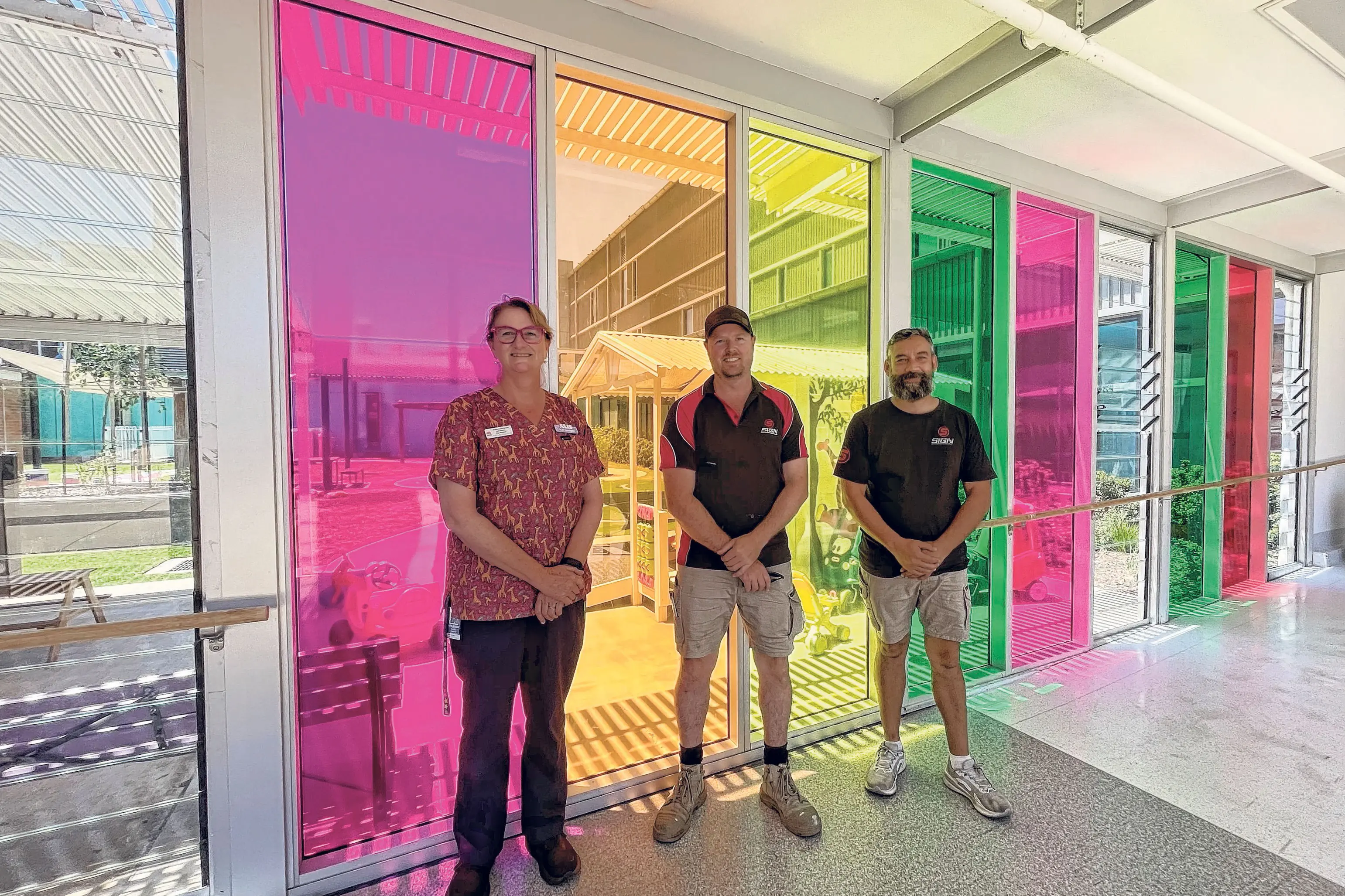 Decorative film has been installed across the corridor windows, helping to soften the view of the busy hospital surroundings while creating a calmer, more welcoming atmosphere for children receiving care.